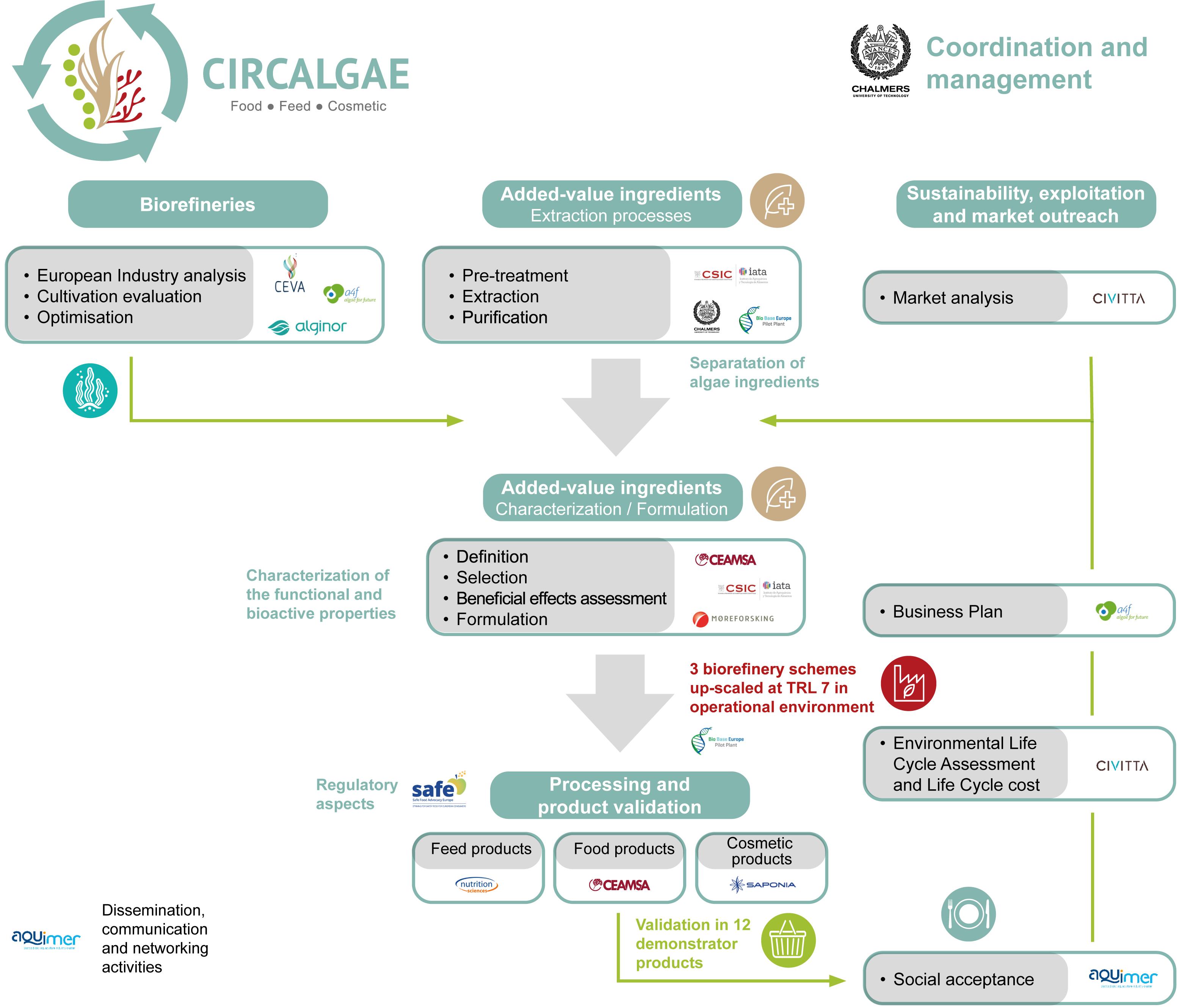 CIRCALGAE is divided into 7 work packages and 3 main activity families (research, validation and market acceptance, communication and management).